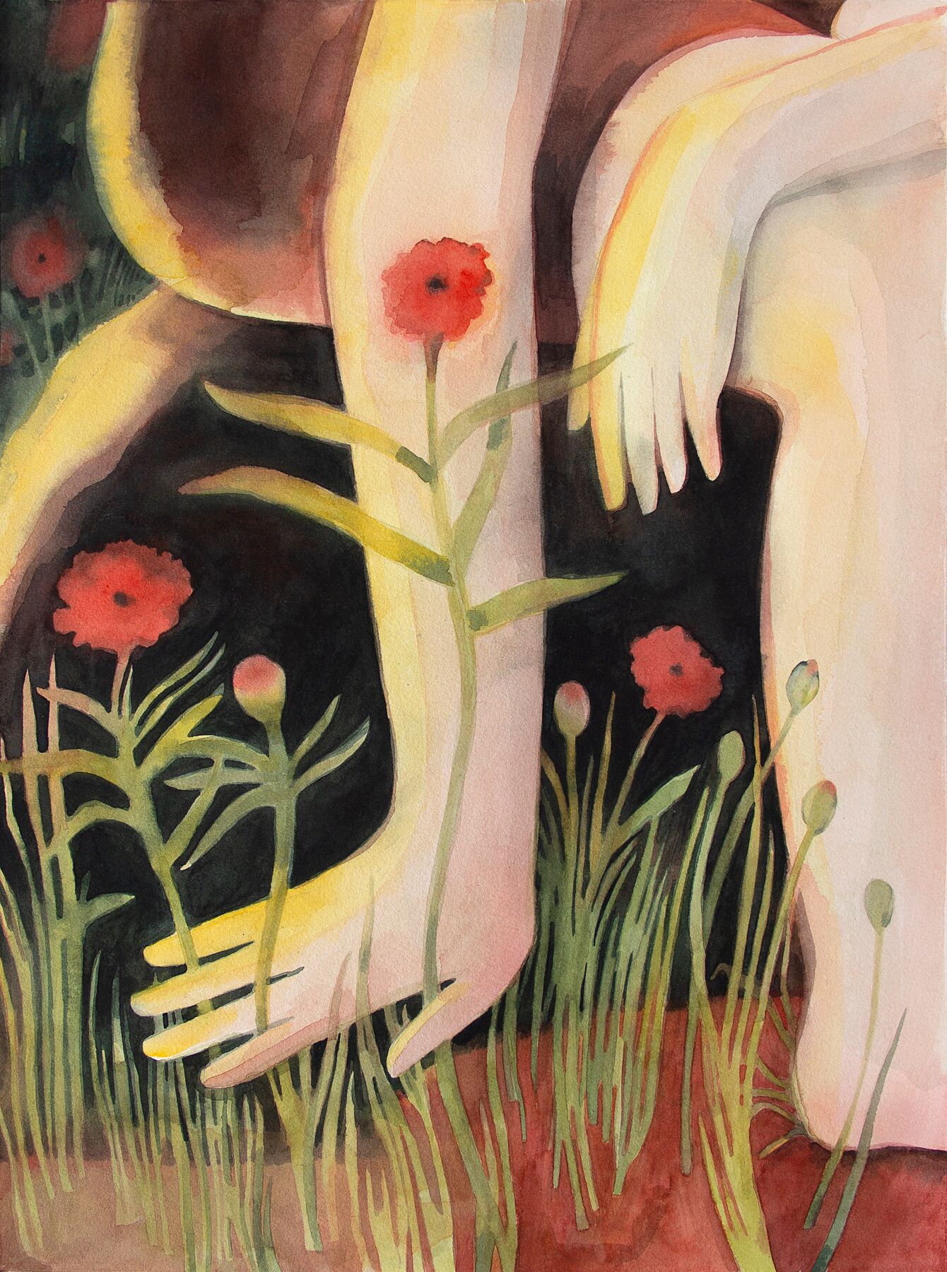 "Humedades, III depicts a scene in which the subject and natural motifs intertwine, not only through the merging of forms but also through the haziness inherent in the watercolor technique. The framing suggests that connection itself is more significant than the subject’s identity, dissolving boundaries between self and environment."