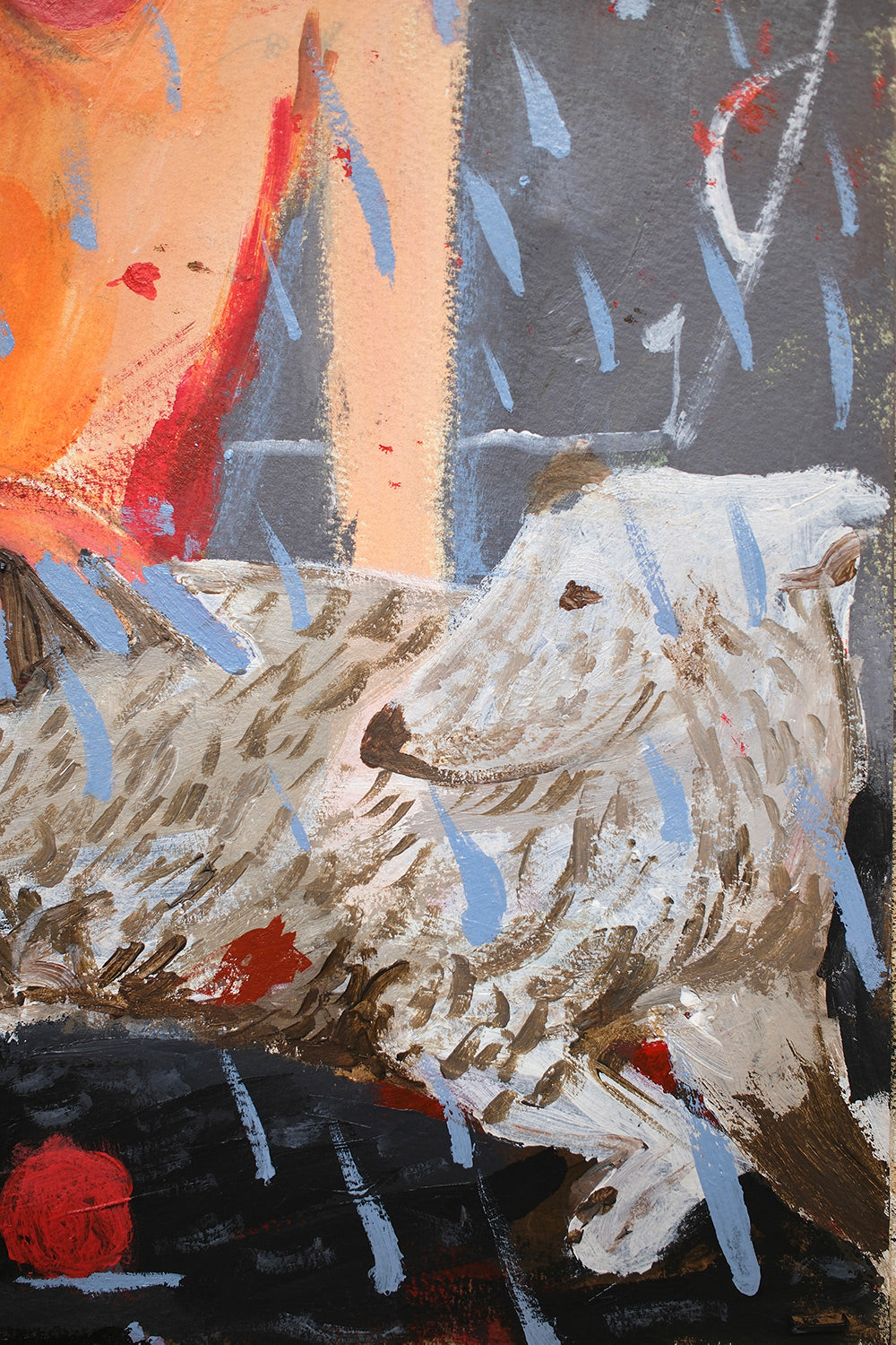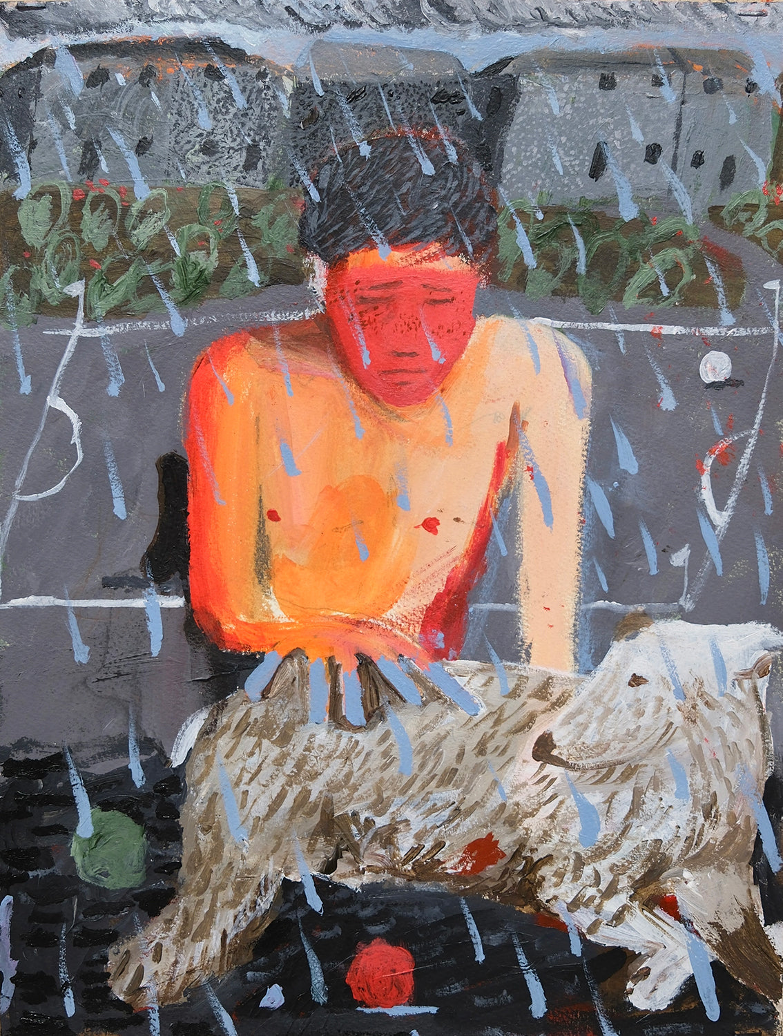 "This painting is an understudy for a new series of work coming out in 2026 where Bagilhole will be retracing his footsteps from his upbringing in rural north Wales. The painting features two of the recurring characters from his work, the boy being a male figure that has been featured in work repeatedly for 10 years and the white dog is a nod to his family dog bach home in Wales that also makes quite a frequent occurrence in the work."